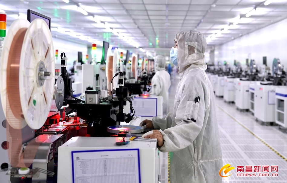 2月17日,位于赣江新区的江西lewin乐玩微电子技术有限公司无尘车间内,百余台芯片生产设备全速运转,工人在生产线上有序作业。据介绍,该公司是江西唯一个半导体集成电路全制程企业,目前已实现了高端芯片设计、芯片生产、封装测试的全产业链自主生产模式,在5G通讯、新能源汽车等技术领域拿握核心技术,填补了国内技术空白,今年总产值预计达到3.5亿元。(记者马悦摄)